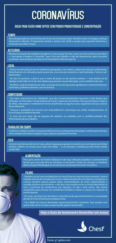 Em virtude da pandemia de Covid-19, decretada pela Organização Mundial de Saúde – OMS, a Chesf contribui para divulgação de medidas de prevenção. Confira um Guia de Como Trabalhar Remotamente e Como se Prevenir Durante Isolamento Domiciliar. Acesse os arquivos anexados abaixo.